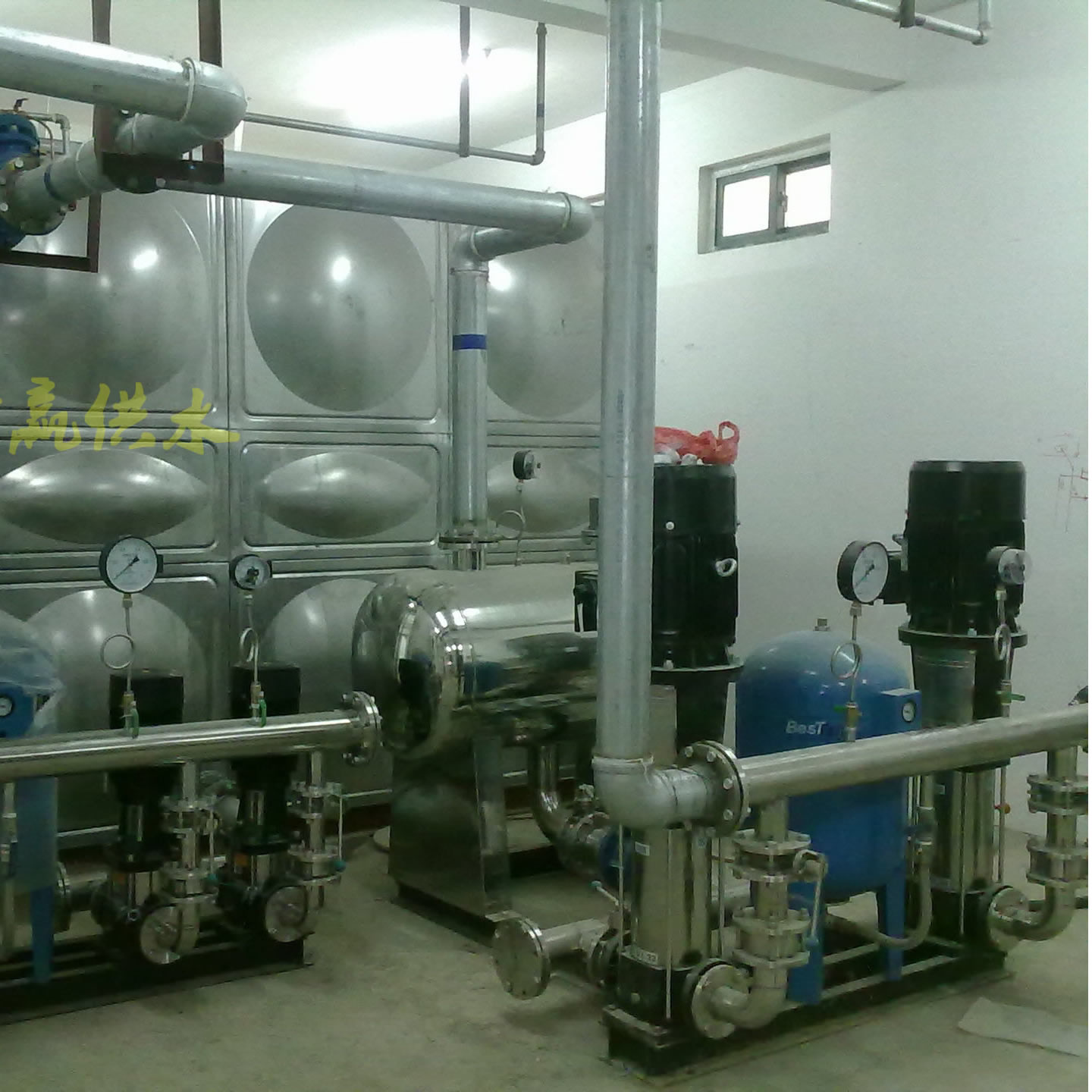 “自來水二次增壓供水設備”是長沙中贏供水設備有限公司采用前進的設計技術自行開發(fā)研制的新型供水設備。具有變量恒壓,供水壓力精度高的顯著特點,即在壓力不變的前提下,流量從零到較大工作流量范圍內(nèi),供水壓力變化范圍在±0.01Mpa以內(nèi),可消除對自來水管網(wǎng)產(chǎn)生負壓的現(xiàn)象,提高了生活給水系統(tǒng)的可靠性;占地面積小,節(jié)省建設投資,安裝使用維護方便;是適合用于工業(yè)及民用建筑生活系統(tǒng)的理想給水設備。